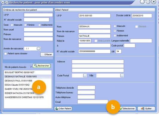 1. Recherche le nom du patient pour lequel elle souhaite prendre les rendez-vous,