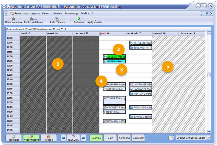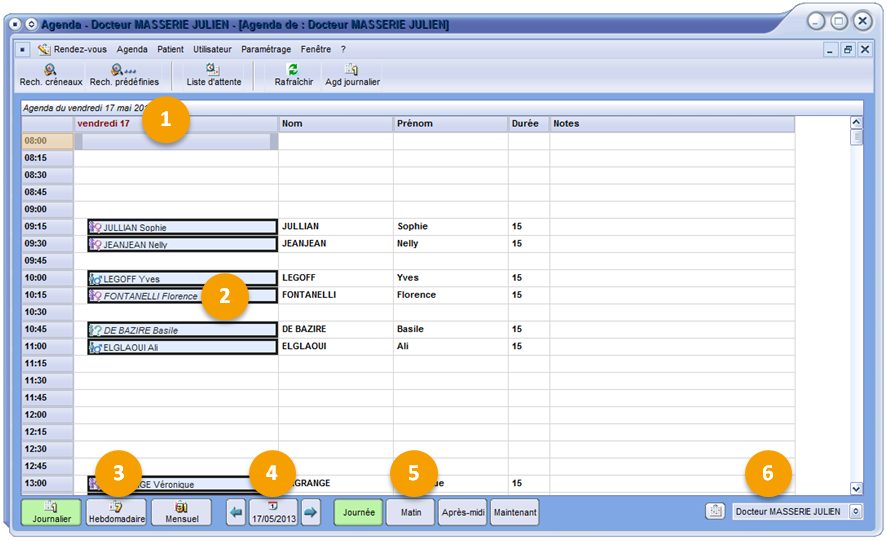 Boutons permettant d’afficher les rendez-vous de toute une journée, d’une matinée, d’un après-midi ou du jour.