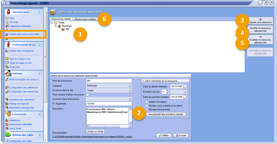 Les ressources matérielles sont toutes les machines, les salles, les instruments, etc... mises à disposition du professionnel de santé, afin que celui-ci exerce au mieux son activité quotidienne. Certaines de ces ressources matérielles peuvent nécessiter un entretien régulier pour un meilleur fonctionnement.