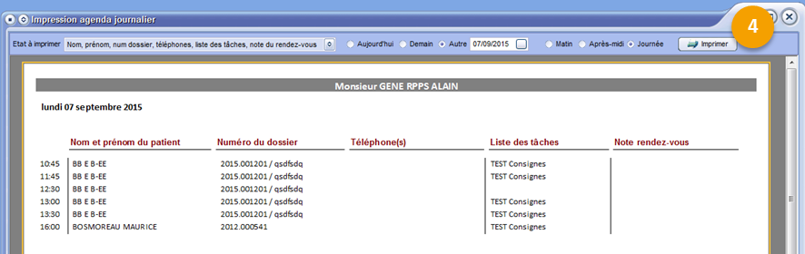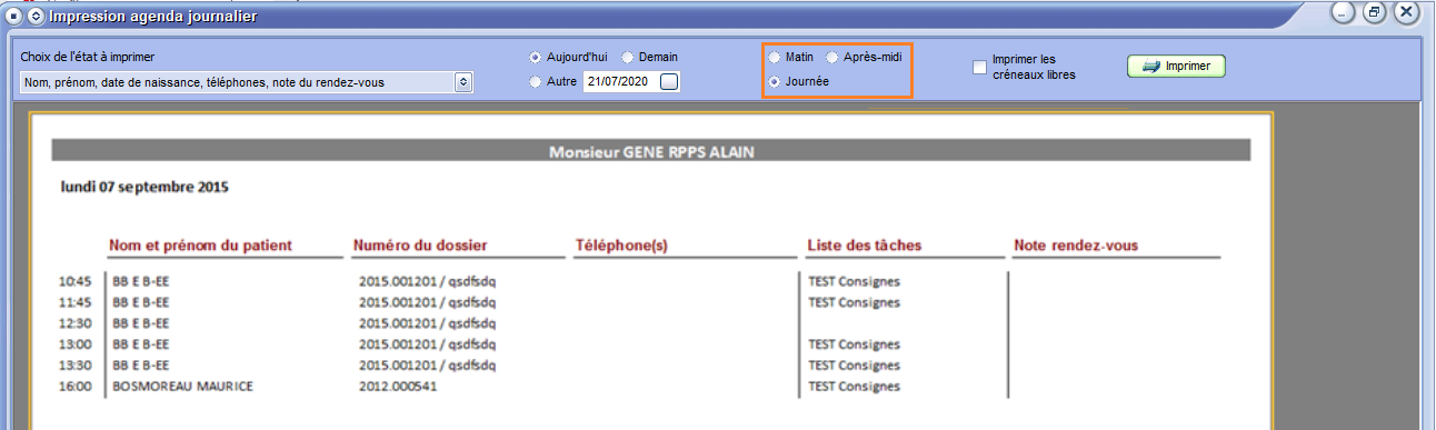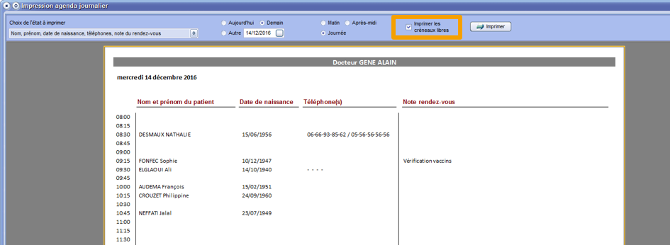 En cochant l'option Imprimer les créneaux libres, le document final fera apparaître tous les créneaux (pour les jours et heures ouvrés) définis pour la journée sélectionnée, qu'il y ait un rendez-vous ou non.