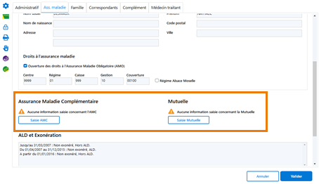 Dans la zone Assurance Maladie Complémentaire, vous avez la possibilité d'ajouter ou modifier les informations AMC et mutuelle.