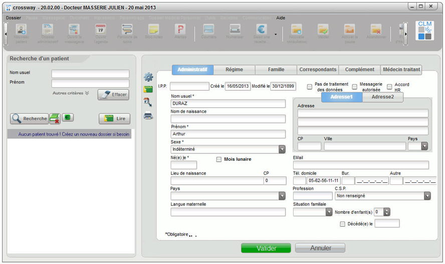 Pour les patients n'ayant pas encore de dossier, l'écran du dossier administratif apparaît automatiquement avant celui de la consultation. |