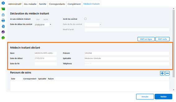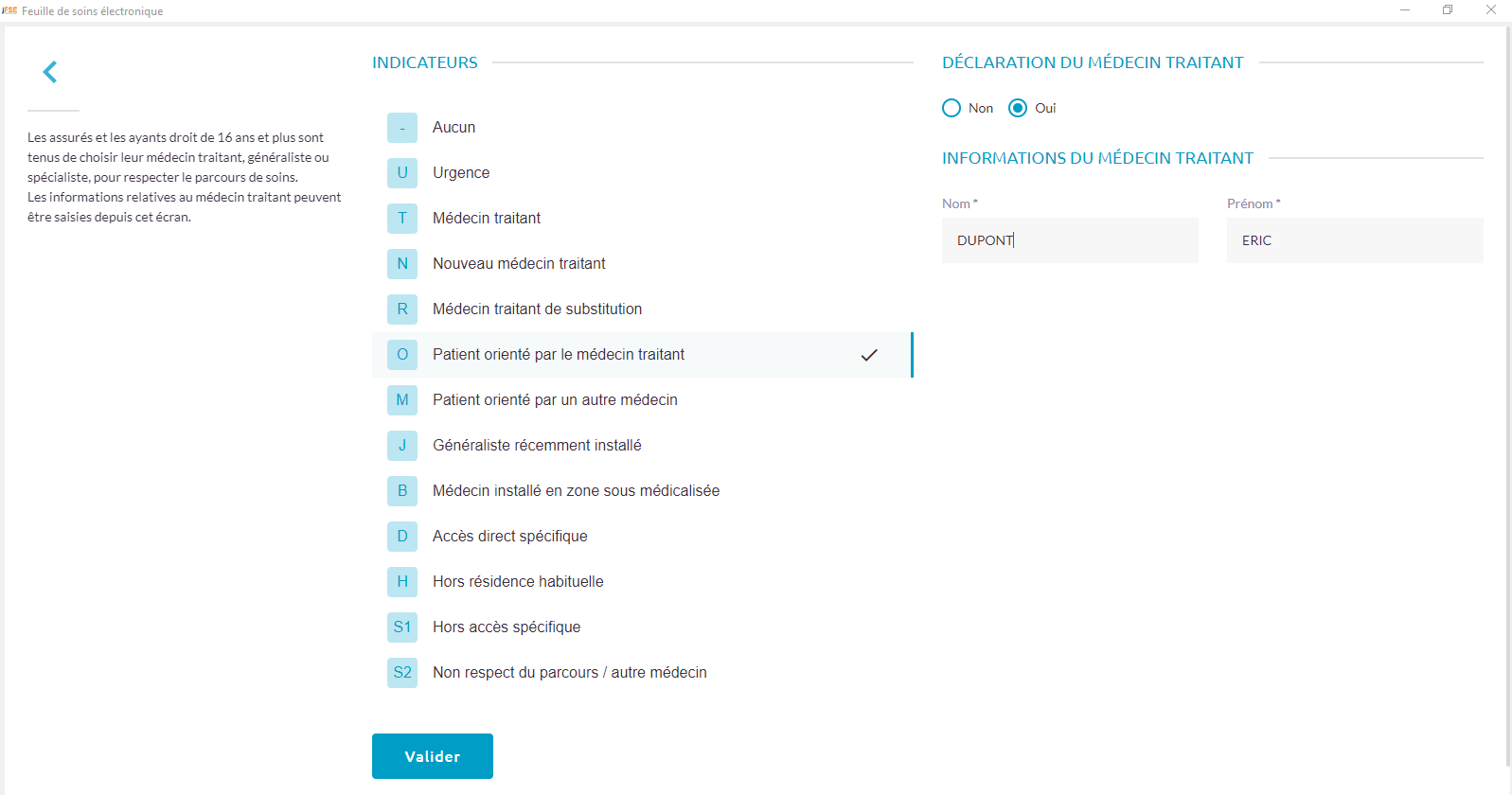 : permet de modifier l'indicateur, de déclarer le médecin traitant et de saisir les informations du médecin traitant.