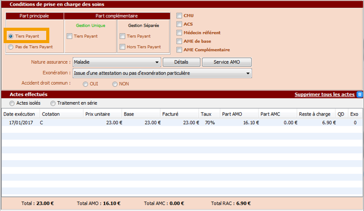 1. En cours d'élaboration d'une feuille de soins, dans la zone Part principale de la feuille de soins, cochez l'option Tiers payant