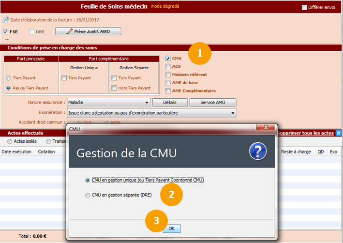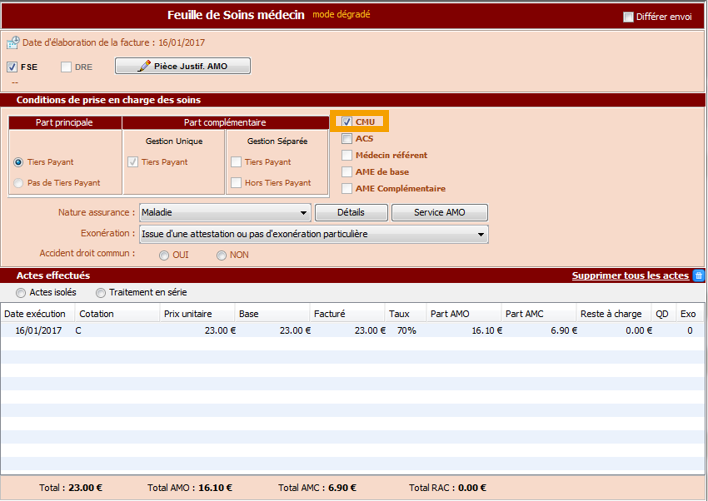 Si la carte Vitale du patient est à jour, et que le patient est en tiers payant CMU, alors sur la feuille de soins l'option est cochée par défaut.