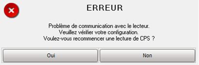 Redémarrez votre lecteur de carte CPS. Si votre lecteur est de marque SAGEM, appuyez sur les touches Jaune et Point. Si votre lecteur est de marque XIRING, appuyez sur la touche de mise en marche pendant 5 à 10 secondes. Si cela ne suffit pas, redémarrez votre ordinateur. | |||