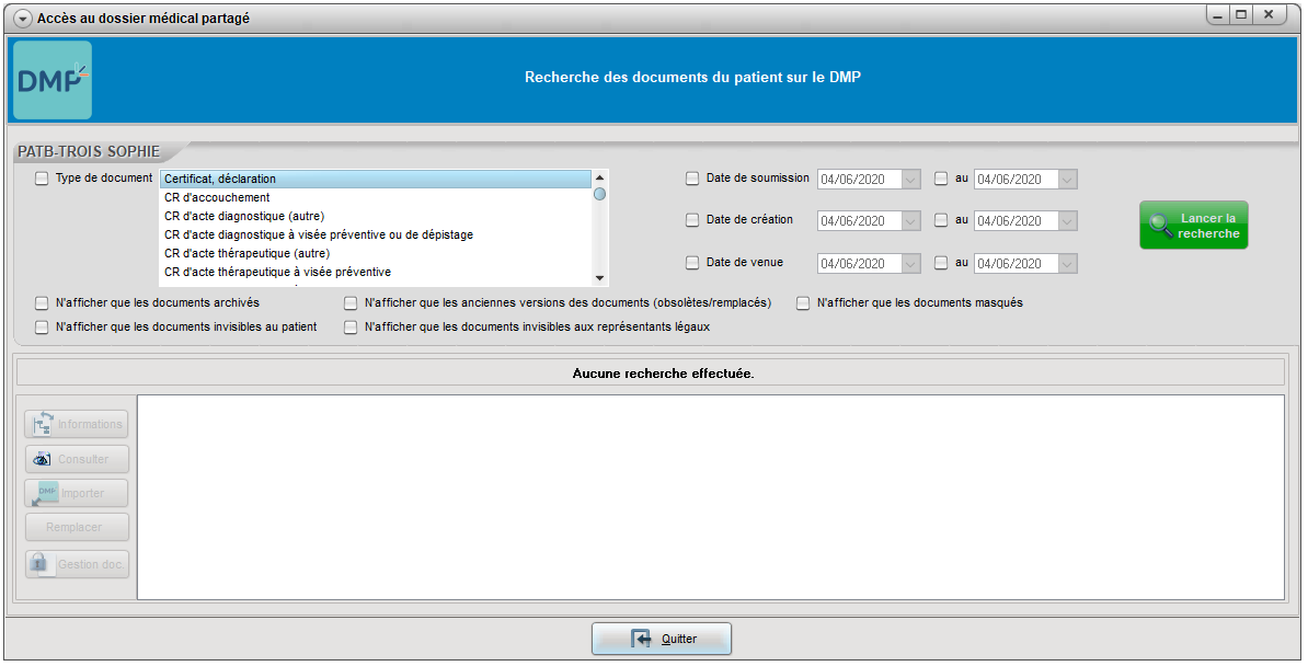 de la barre de boutons.Si le patient est mineur, la fenêtre de connexion secrète qui vous permet de rendre visible ou pas les documents aux représentants légaux, s'ouvre.