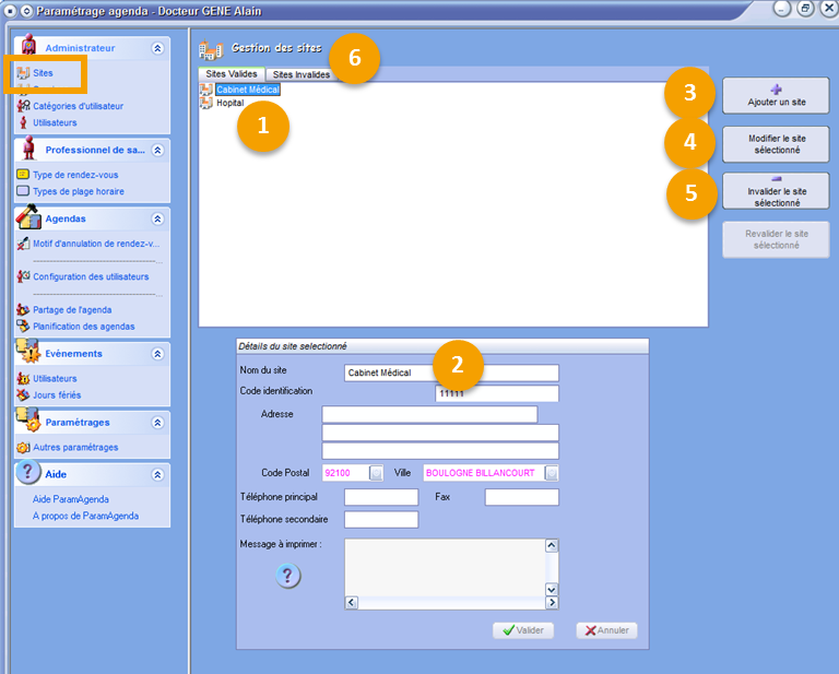 Un site est un ensemble de services. Il peut s’agir par exemple du cabinet médical. Il faut au minimum un site.