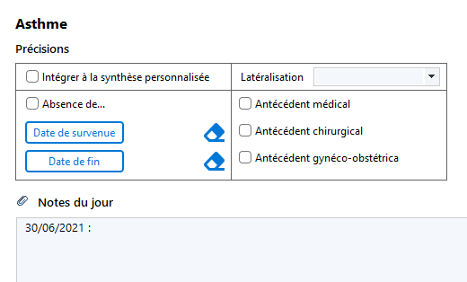 pour passer de la synthèse standard à la synthèse personnalisée.Absence de : permet d’indiquer par exemple une absence d’allergie, absence de pathologie présumée...
