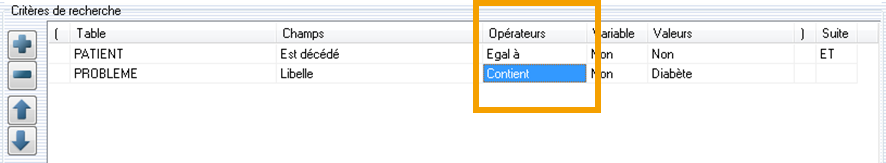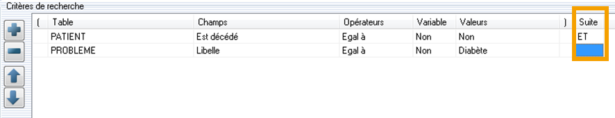 Suite: Et, Ou. Par exemple: Suite est égal à ET. Dans notre exemple le résultat recherche les patients non décédé ET diabétique.