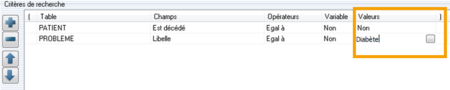 Valeurs: Valeur à saisir par vous-même ou à l'aide de Par exemple: Valeurs est égal à Diabète.