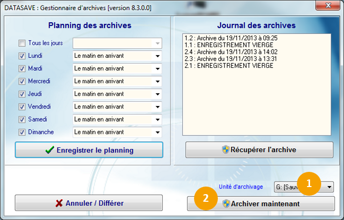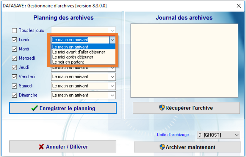 Vous avez la possibilité de planifier des rappels automatiques pour penser à copier vos données. Pour cela dans la section Planning des archives indiquez pour un jour particulier ou tous les jours simultanément à quel moment vous souhaitez visualiser le rappel :