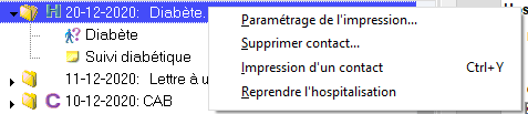 Vous pouvez modifier une hospitalisation en faisant un clic-droit dessus et en sélectionnant l'option Reprendre l'hospitalisation. ![]() Vous pouvez également reprendre la plus récente des hospitalisations en sélectionnant le patient, puis en cliquant sur le menu , puis . |