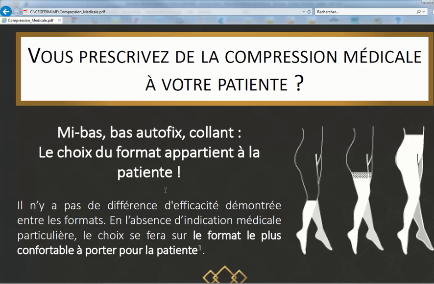 Votre patiente est âgée de 25 à 70 ans et a une pathologie déjà connue ou saisie (Insuffisance veineuse, Jambes lourdes, Varices, Thrombose veineuse, Œdème des membres inférieurs).