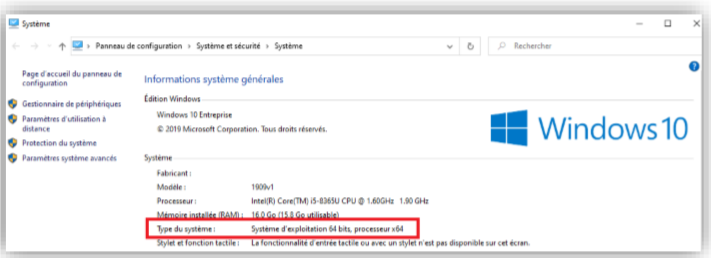Pour vérifier le type de système d'exploitation de votre poste, accéder aux propriétés en faisant un clic droit sur l’icône "Mon PC" sur le bureau de votre poste. L'information est indiquée comme c--dessous :
