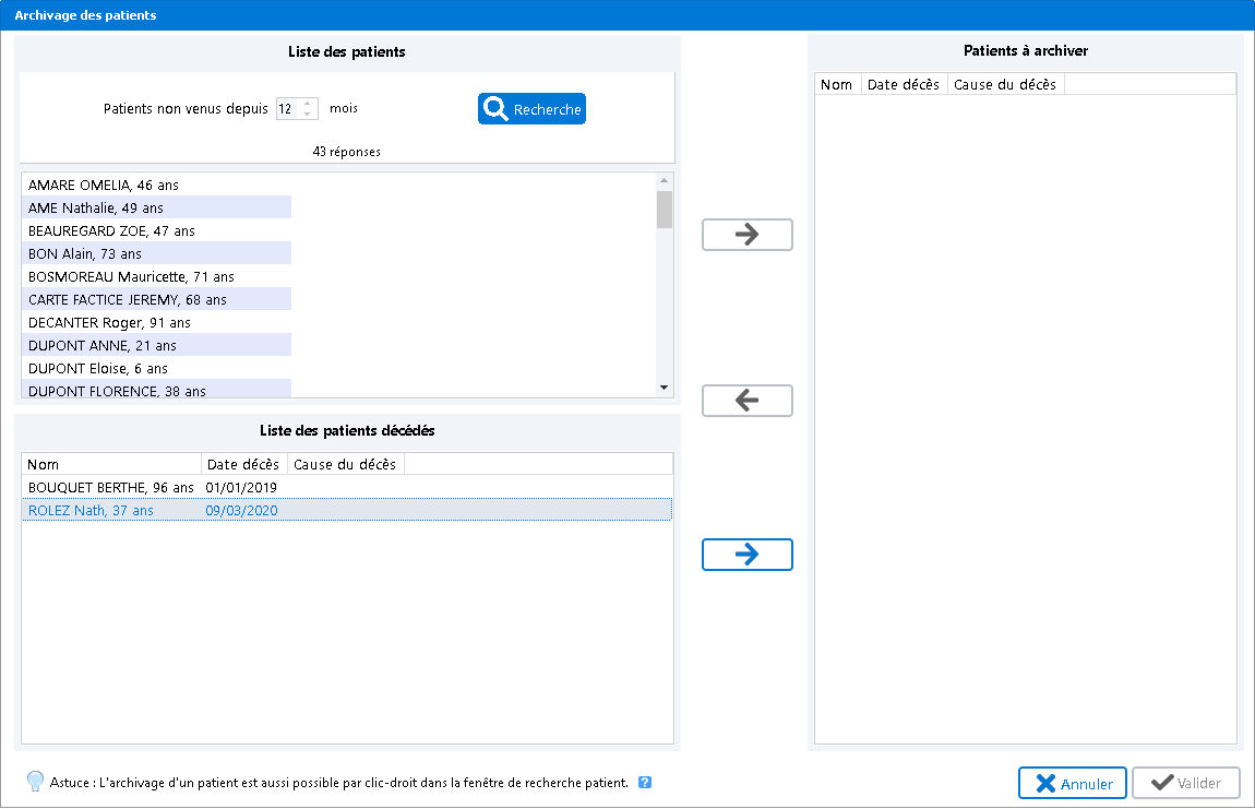 Le nom du patient se retrouve dans la colonne des Patients à archiver.