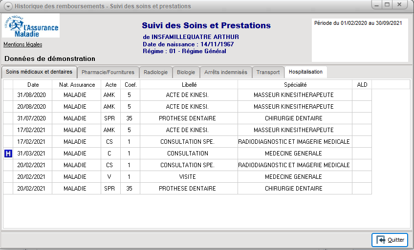La fenêtre Historique des remboursements - Suivi des soins et prestations apparaît :