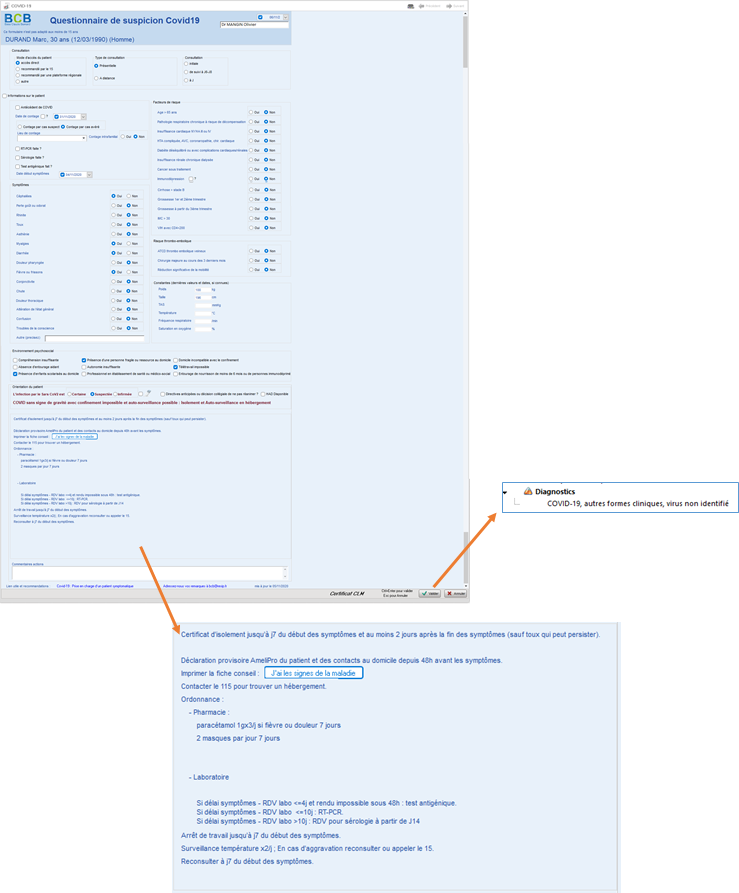 Grâce au formulaire COVID, un résumé et une orientation du patient vous sont proposés.
