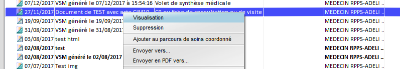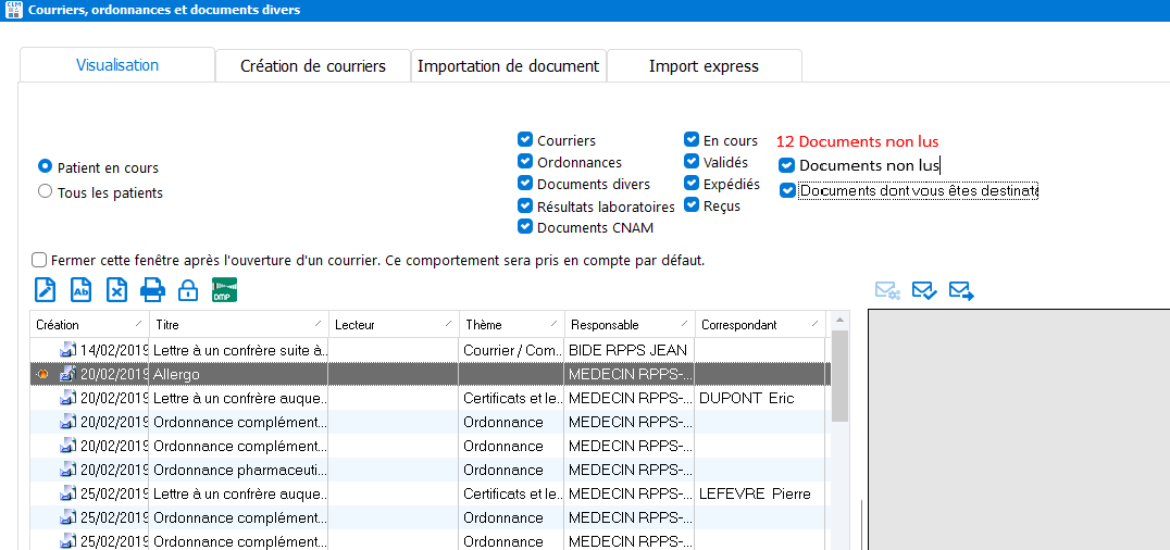 Vous visualisez le nom du Professionnel de Santé en cours de session dans la colonne Lecteur.