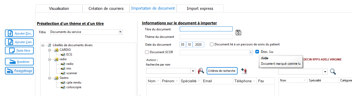 dans la barre de boutons, puis sur l'onglet Importation de document,La notion de Doc. lu vous permet d'importer un document et de déclarer celui-ci directement comme Doc. lu.