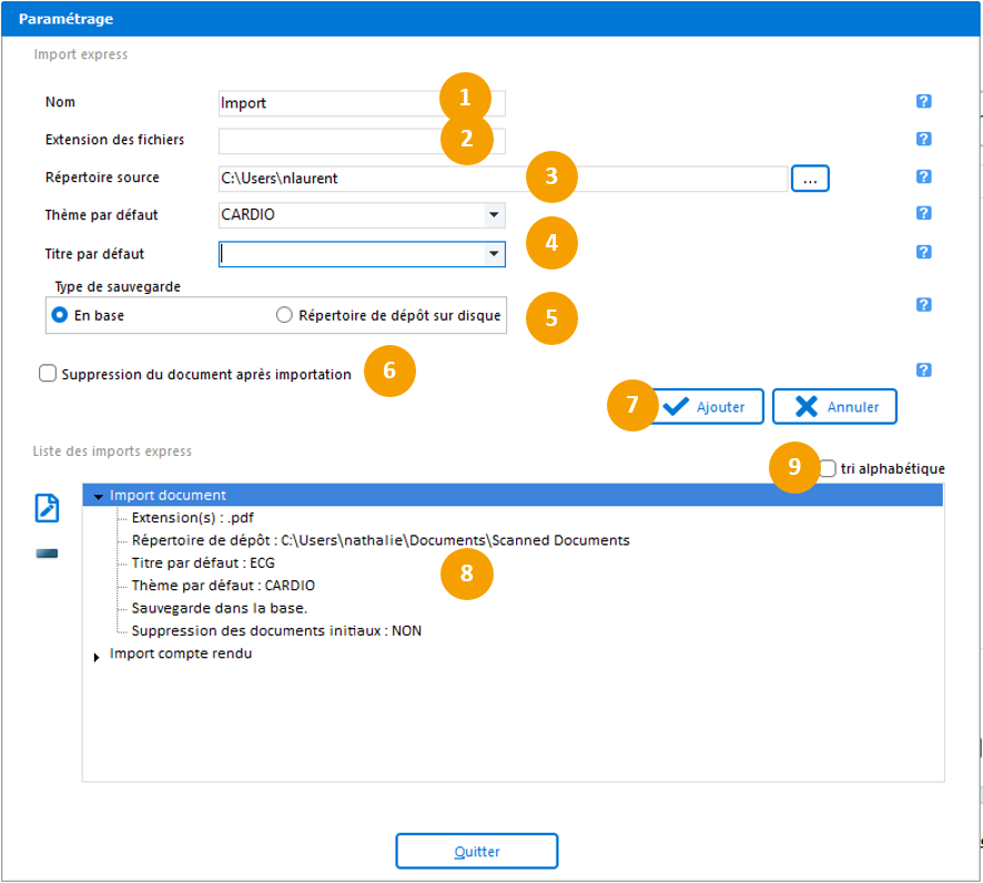 Suppression du document après importation : Option à cocher si vous souhaitez supprimer les documents numérisés du répertoire source après l'importation dans les dossiers des patients.