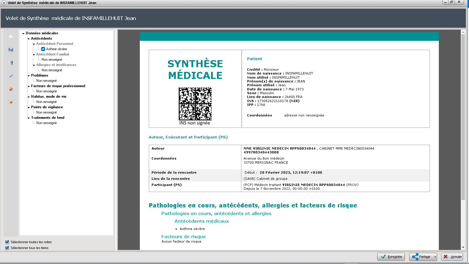 Une fenêtre s'affiche présentant le Volet de Synthèse Médicale généré automatiquement en prenant en compte les informations médicales existantes dans le dossier du patient. ainsi que toutes les informations concernant l'Identité Nationale de Santé (Datamatrix).