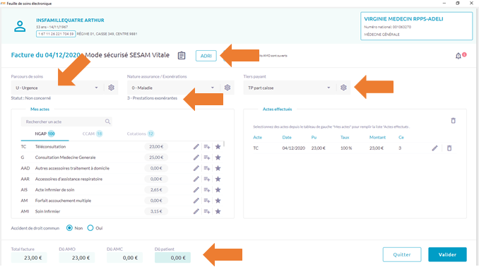 La facturation de la téléconsultation nécessite de renseigner un minimum d’informations administratives concernant le patient afin d’être fiabilisée par le service en ligne ADRi (Acquisition des Droits Intégrés, carte CPS et connexion internet nécessaires).