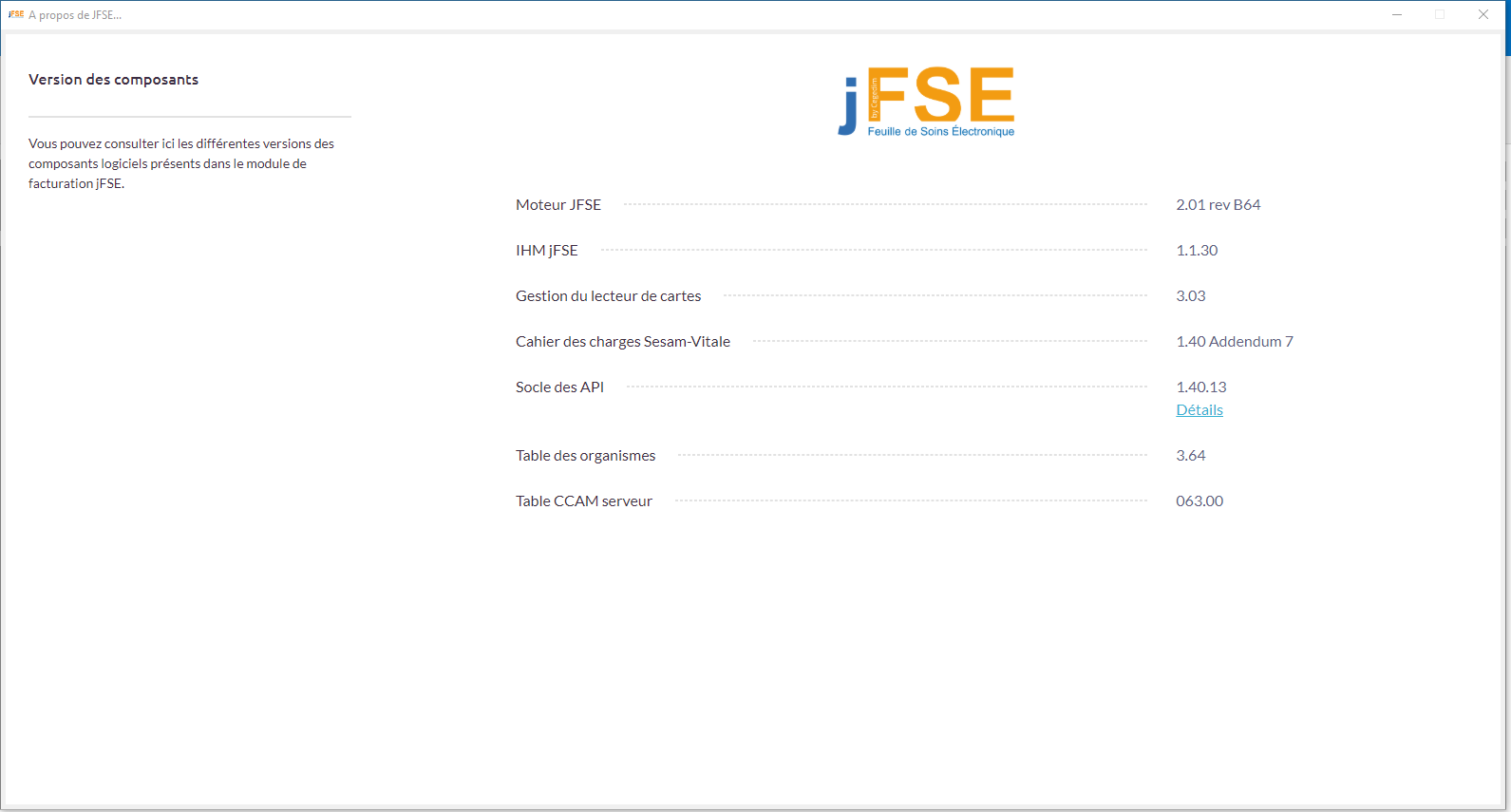 | . | Aide en ligne Crossway v24.01 > La Feuille de soins (JFSE V2) > Les paramétrages > Connaître la version des composants SESAM-Vitale |