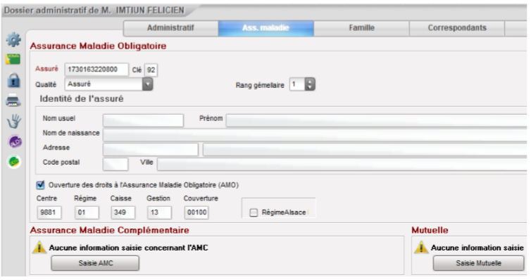 S’il s’agit d’un nouveau patient, vous devez saisir ces informations dans le dossier administratif (l'onglet Ass maladie) .