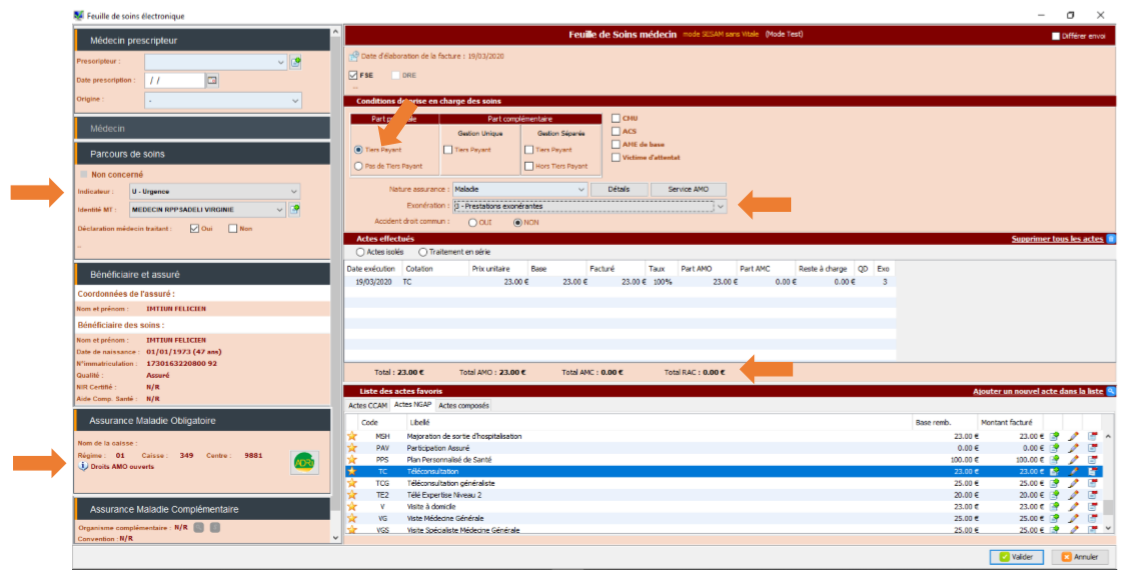 Compte tenu du contexte, il est recommandé de pratiquer le tiers payant AMO. Sur la droite dans les « Outils », cliquez sur « Tiers Payant » et cochez « Tiers Payant » en part principale (RO).
