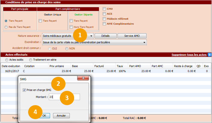 Le Tiers Payant est activé automatiquement, et le montant restant à la charge du patient (RAC) est égal à 0.