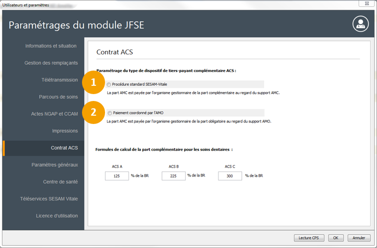 Dès l'élaboration de la feuille de soins, l'option ACS est cochée, et dans la section Bénéficiaire et assuré vous trouvez l'information sur le type de contrat ACS :