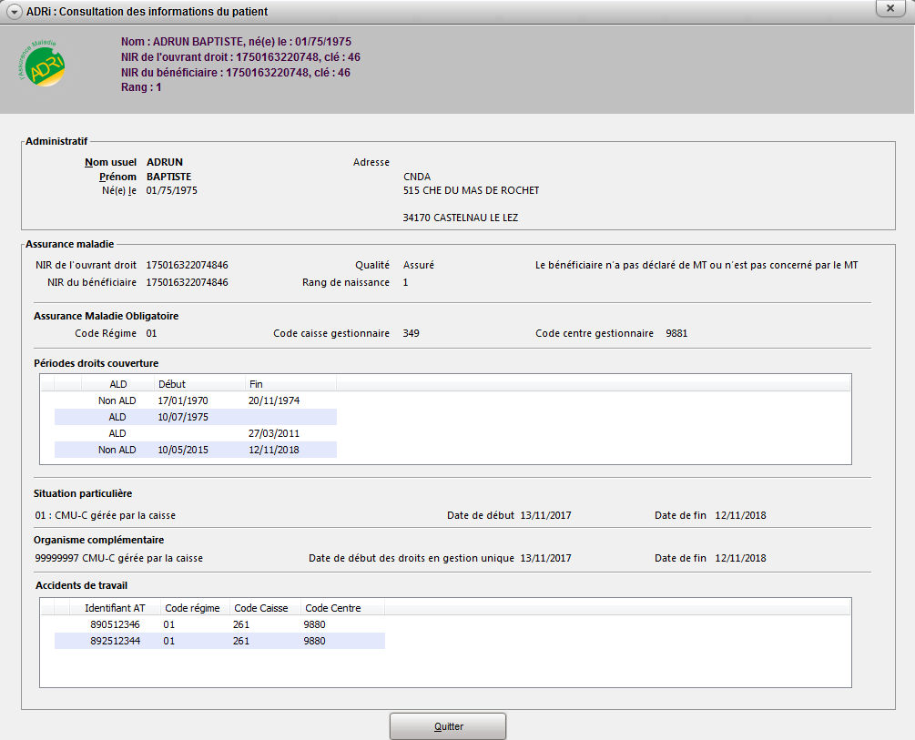 la fenêtre ADRi : Consultation des informations du patient s'ouvre :