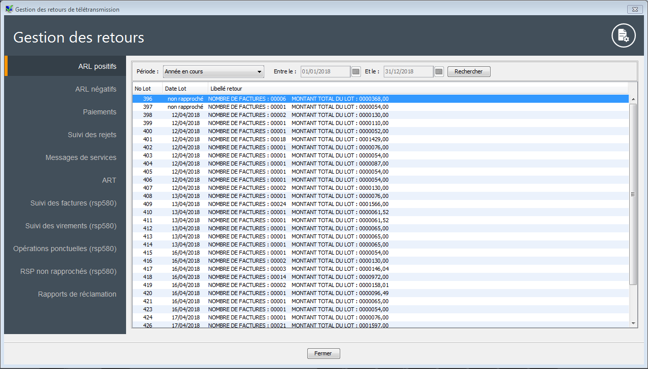 Cet écran vous liste les Accusés de Réception des Lots télétransmis aux caisses sur une période prédéfinie (<Personnalisée>, Journée en cours, Semaine en cours, 7 derniers jours, Quinzaine en cours, 15 derniers jours, Mois en cours, 30 derniers jours).