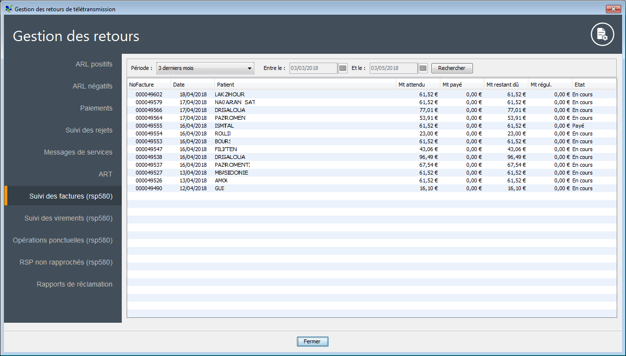 Liste des factures en tiers payants, télétransmises via la nouvelle norme de télétransmission, pour une période prédéfinie (<Personnalisée>, Journée en cours, Semaine en cours, 7 derniers jours, Quinzaine en cours, 15 derniers jours, Mois en cours, 30 derniers jours).