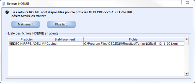 Lorsque vous télétransmettez vos feuilles de soins, Crossway réceptionne les retours ARL mais également le fichier Noémie. Quand vous ouvrez le module des recettes, il détecte alors ce fichier et vous demande si vous souhaitez ou non le traiter.