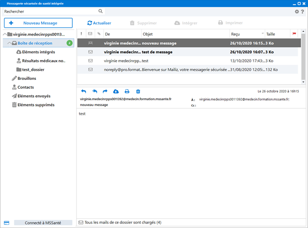 Notez qu'une barre de progression en bas de l'écran vous indique si vous êtes connecté à MSSanté.