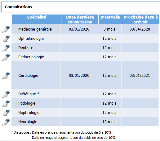 visualiser les dates des dernières consultations et des prochaines à venir par spécialité,