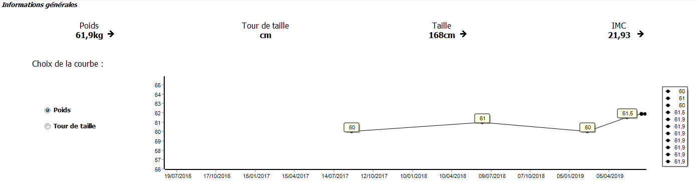 Les Informations générales reprennent les données biométriques (poids, taille, IMC), suivant la période d'affichage définie (6 mois, 1 an, 2 ans et 3 ans).