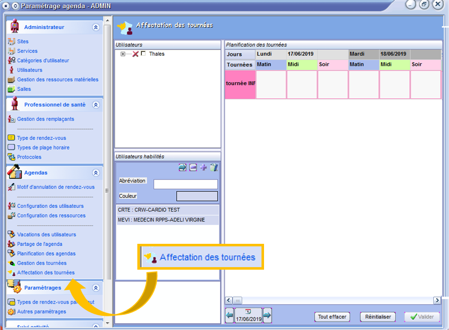 Pour affecter des tournées à vos rendez-vous, cliquez sur Affectation des tournées, dans le menu Paramétrages des Agendas.