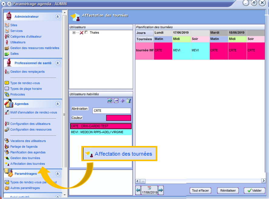 Ensuite, cliquez sur les plages horaires souhaitées pour associer le médecin à la tournée ou faites un glisser / déposer sur la plage horaire voulue. Puis, Validez.