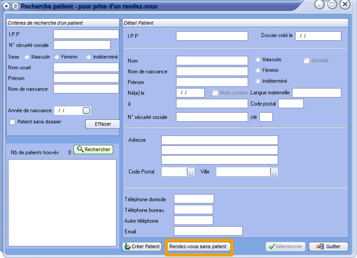 Cliquez sur le créneau horaire souhaité, puis dans la fenêtre de recherche du patient, cliquez sur le bouton .