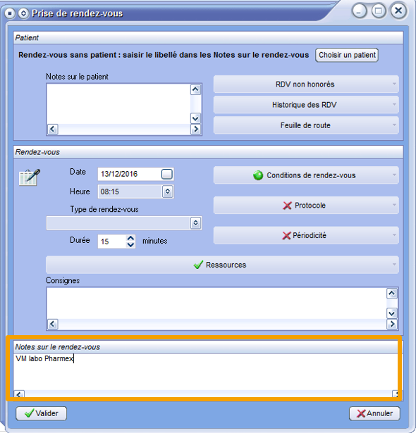 Confirmez le rendez-vous. Les rendez-vous sans patients apparaissent dans l'agenda en italique.