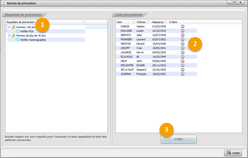 Vous pouvez ainsi facilement suivre la réalisation des alertes pour une liste de patients issue d'une requête de prévention.