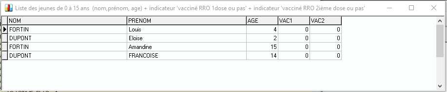 Indicateur : Liste des enfants de 0 à 15 ans (nom, prénom, âge) + indicateur "vacciné RRO 1 dose ou pas" + indicateur "vacciné RRO 2ème dose ou pas"