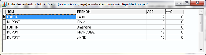 Indicateur : Liste des enfants de 0 à 15 ans (nom, prénom, âge) + indicateur "vacciné Hépatite B ou pas"
