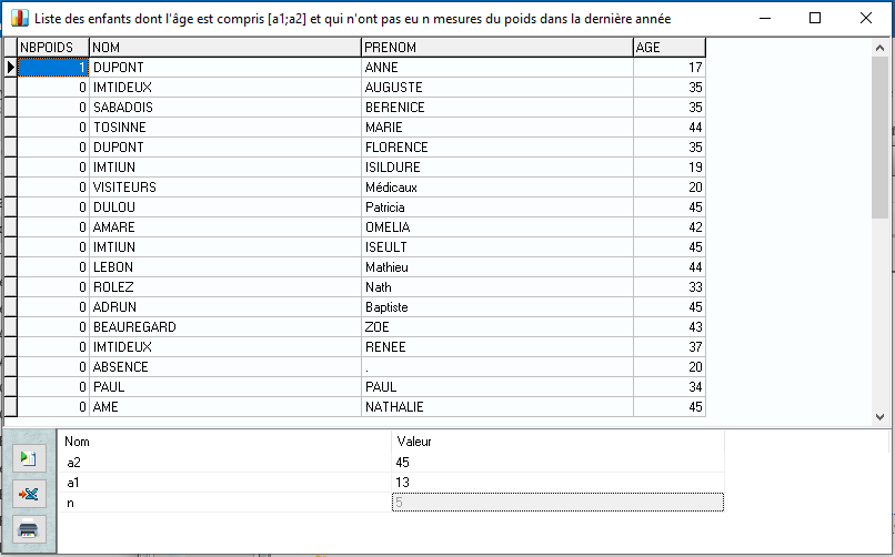 Dans notre exemple, nous recherchons les patients de 0 à 20 ans pour lesquels vous avez saisi moins de 10 mesures de poids sur les 12 derniers mois.