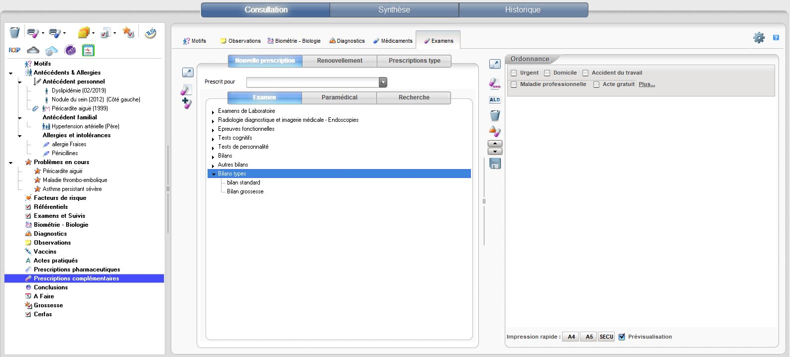 En cours de consultation vous trouverez ce bilan biologique type, dans l'item Prescriptions complémentaires ou Examens, dans l'onglet Examen, puis Bilans types.