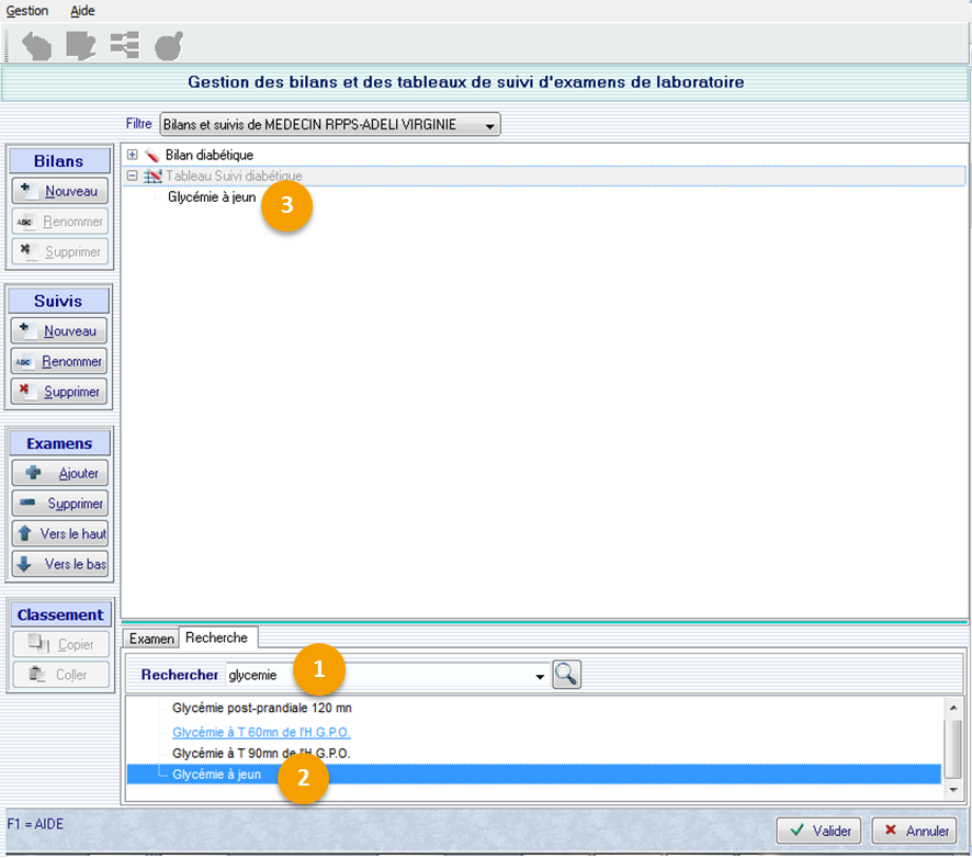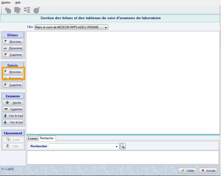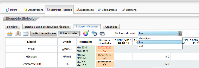 Vous avez la possibilité, de créer des tableaux de suivi de vos examens de laboratoire, afin de visualiser ceux-ci plus rapidement dans Biométrie - Biologie, Biologie : Visualiser.