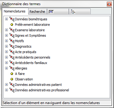 | Affiche / Cache la fenêtre dictionnaire : permet d'afficher la fenêtre de dictionnaire des termes de la consultation. | ![]() |